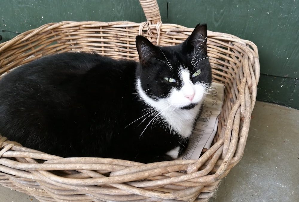 black and white cat in basket